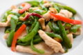 - 肉は1~2センチ程度に小さく切る。インゲンは3センチ程度、ピーマンは1センチ角程度に切る。玉ねぎは薄くスライスする