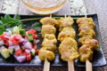 - 同じ幅でクリームチーズを切り、柿とチーズを交互に重ね、ミントの葉をのせ爪楊枝で止める