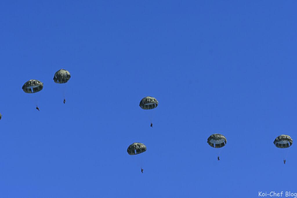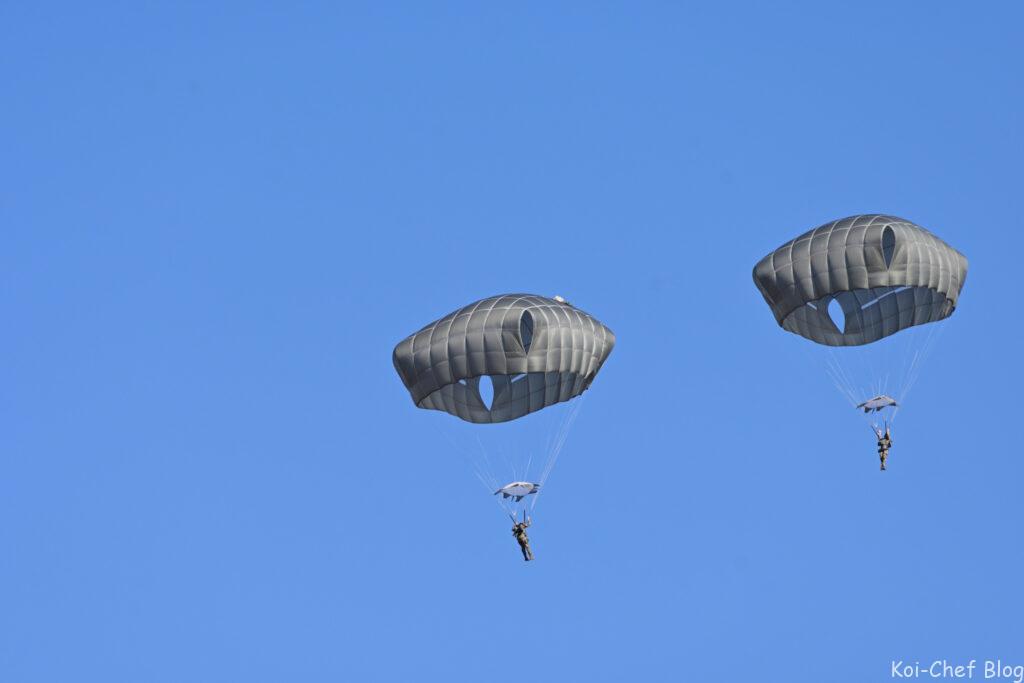 今回は日米英豪4か国が参加。前回2020年に次いで今回も、日本で唯一の落下傘部隊である陸上自衛隊第1空挺団「精鋭無比」を誇る空挺団による迫力のパラシュートの降下を見学、撮影してきました