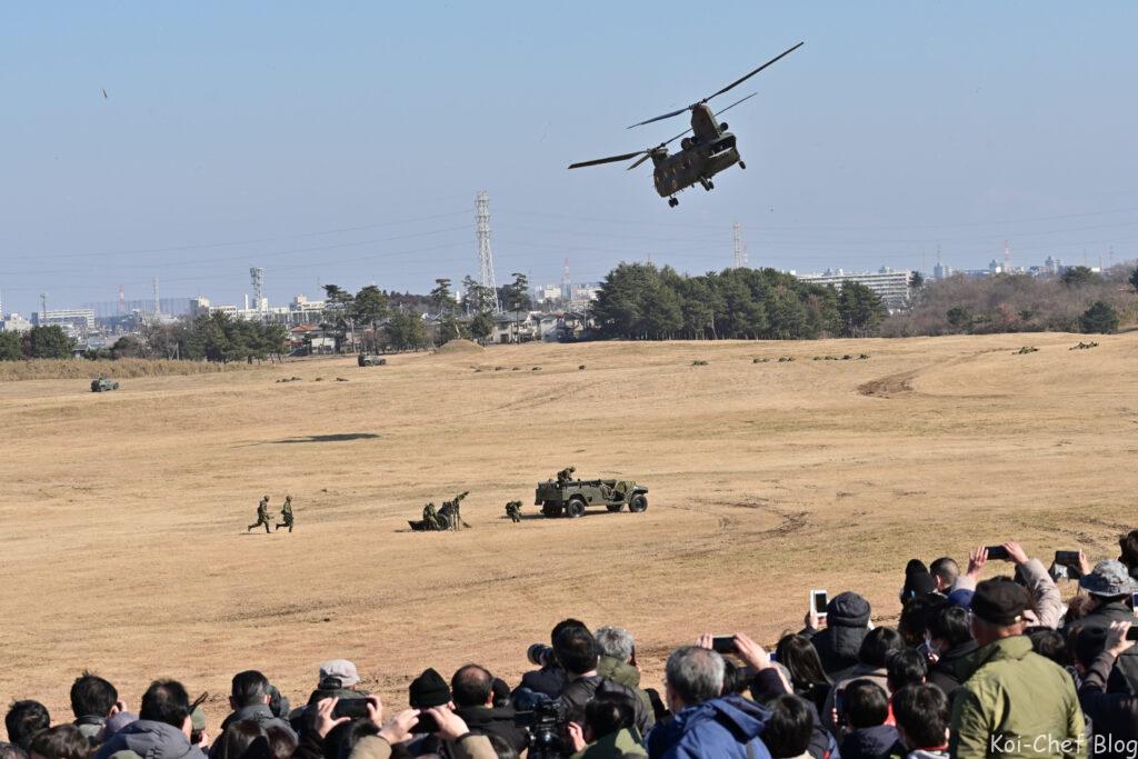 前の方であれば地上戦演習が良く見えます。2列目以降は前の人が邪魔になるので小さ目の脚立がないと厳しいでしょう