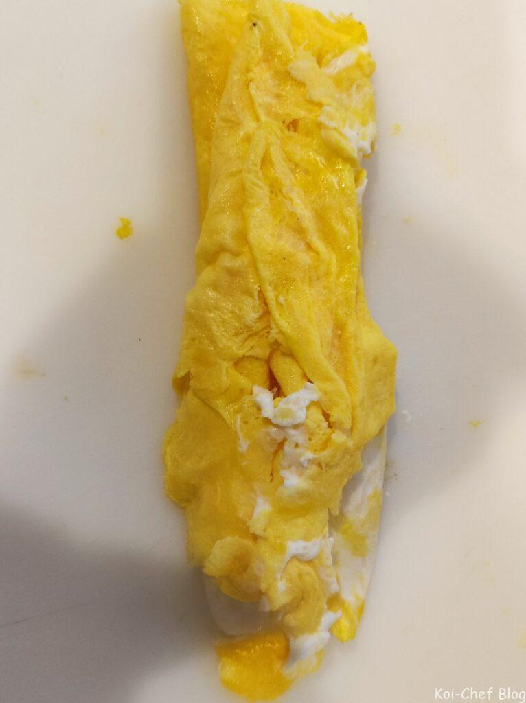 - ボウルに卵を割り入れて塩(少々)を加えて混ぜ合わせ、フライパンにサラダ油を入れて熱し薄焼き卵を2枚作る。卵を折りたたみ細く切る。