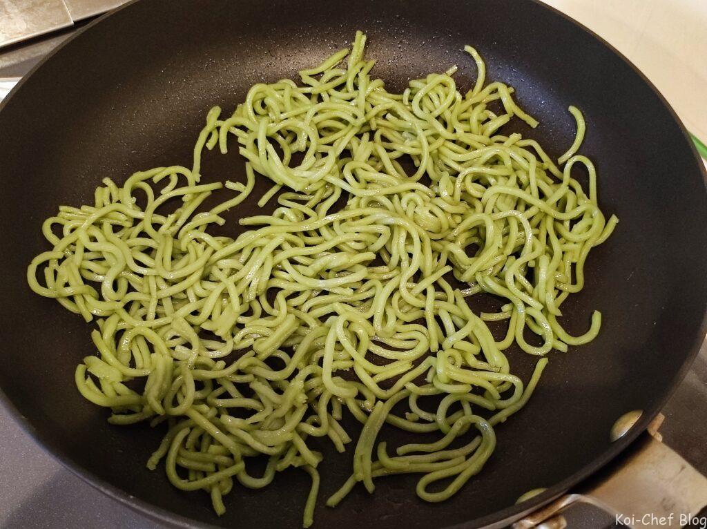 乾麺の場合は時間通り茹でておく。 - フライパンにサラダ油大さじ1を入れ中火で茶そばを炒め、所々焦げるくらいに炒め、器に取り出しておく。