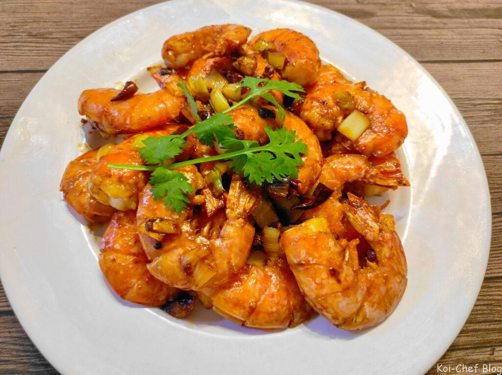 殻付きの海老を油で揚げたらあとは調味料を絡めるだけのシンプルな料理なのですが、