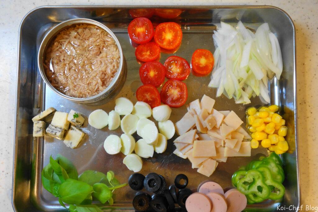 冷蔵庫にあった魚肉ソーセージ、ミニトマト、ピーマン、玉ねぎ、そして長く放置しているチーズにオリーブ、それにいつもストックしているツナ缶にベランダ栽培のバジルなど、あり物です