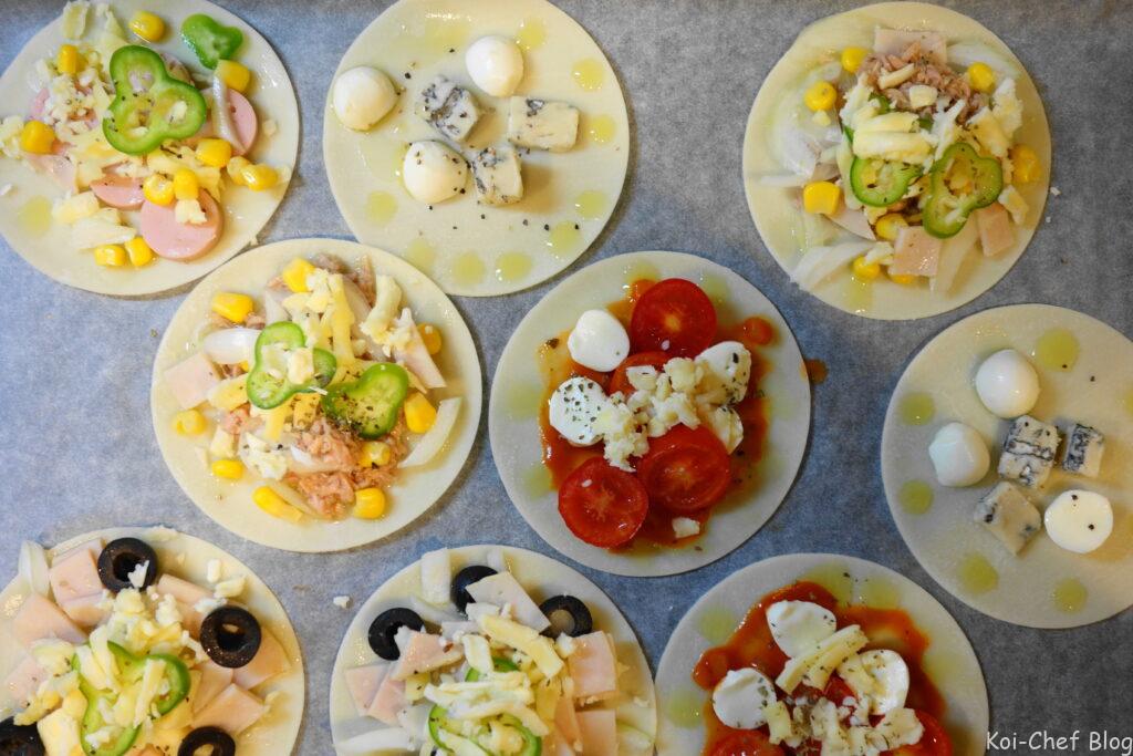 - 魚肉ソーセージ:玉ねぎの上に魚肉ソ、コーン、その上にチーズ、オリーブ、ピーマンを重ねる。