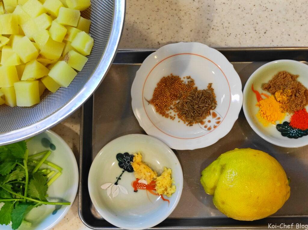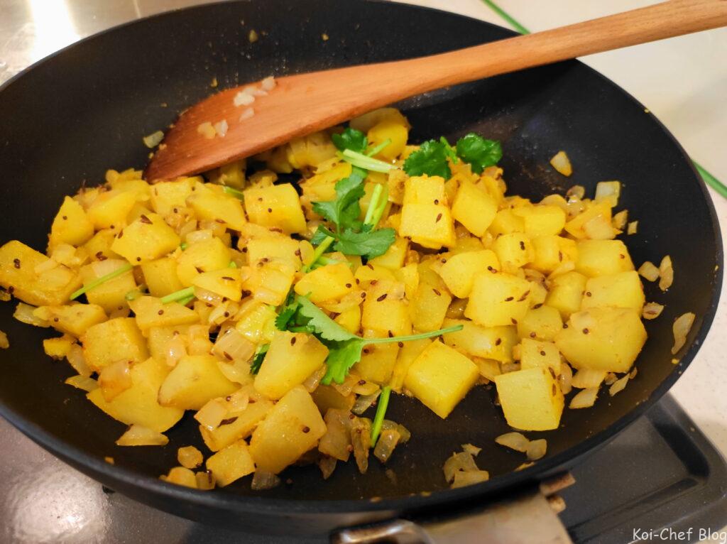 今回は、クミン、コリアンダー、カイエンヌペッパーなど使ったスパイシーなジャガイモ炒め