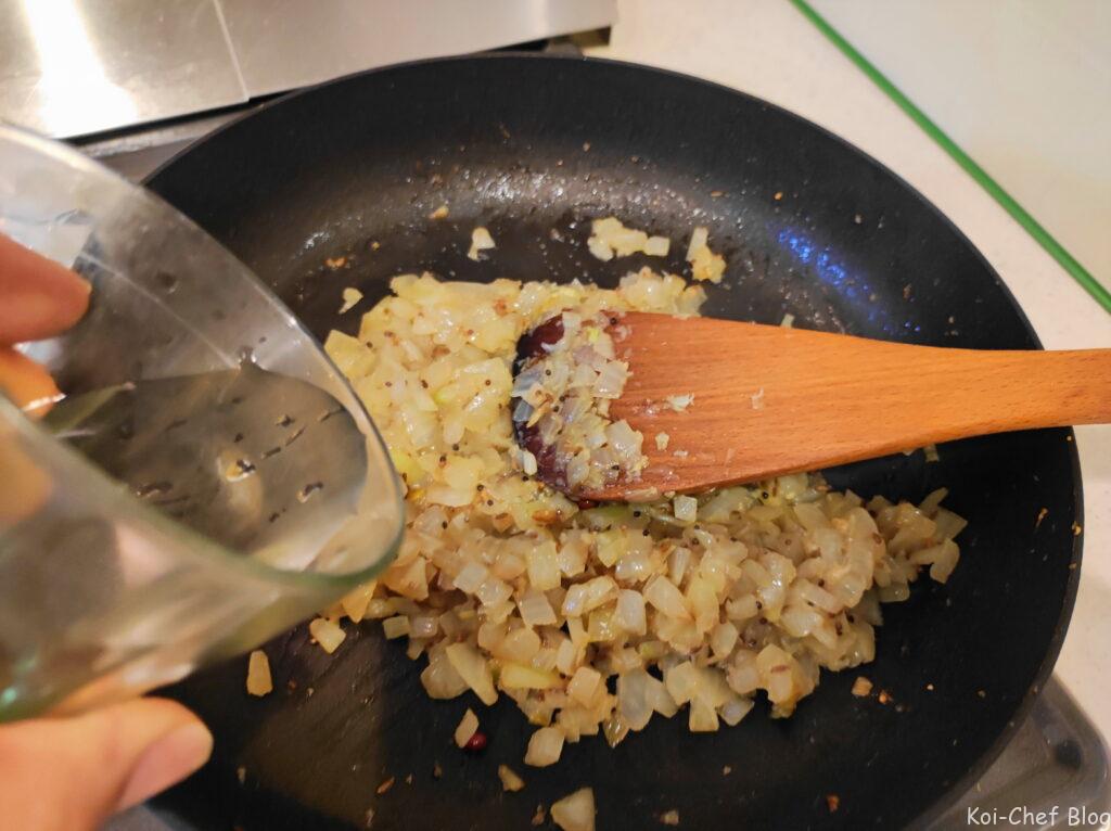 焦げそうになったら水を大さじ1程度を加えて炒める。都度入れては炒める