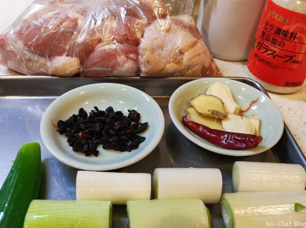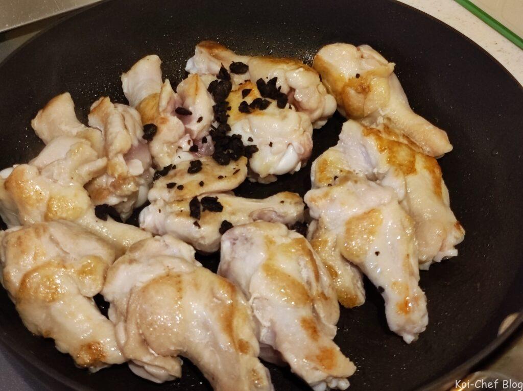 - フライパンに鶏肉を入れ、途中ひっくり返しながら全体に焼き色を付け、豆鼓を入れて軽く混ぜ、水を入れてひと煮たちさせて火を止める