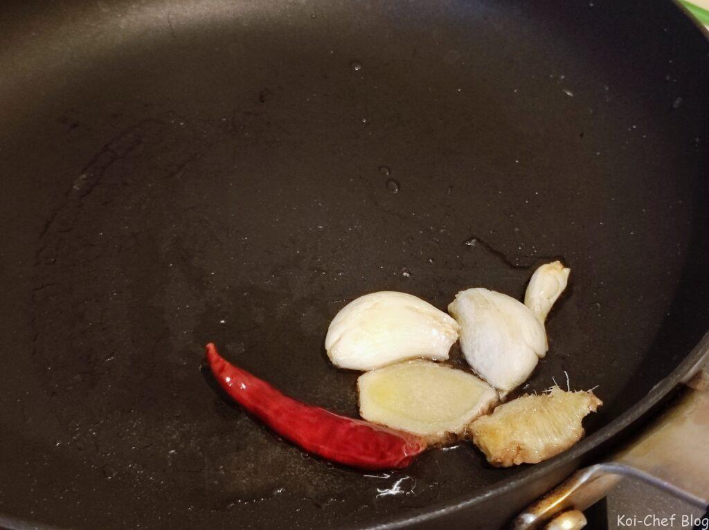 - フライパンにサラダ油をひき、にんにくと鷹の爪を入れ、中火にして香りが出るまで炒める