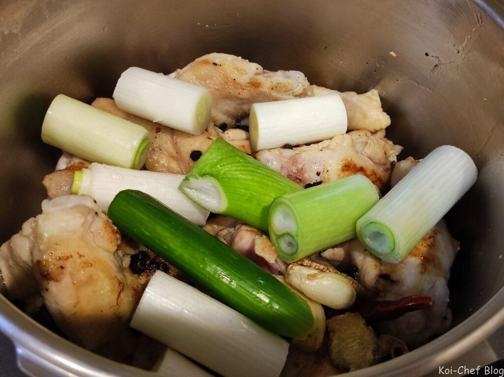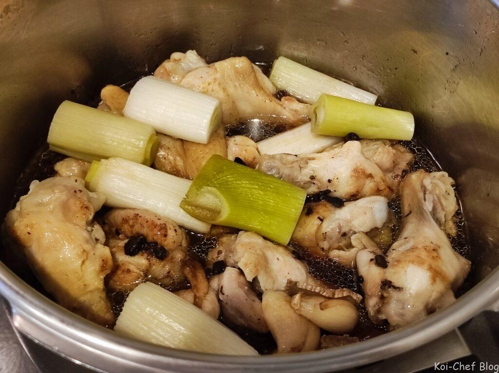 - 圧力鍋にフライパンの中身をすべて(水分も)入れる。ネギ、しょうゆ、中華だしの素、オイスターソースを入れる。