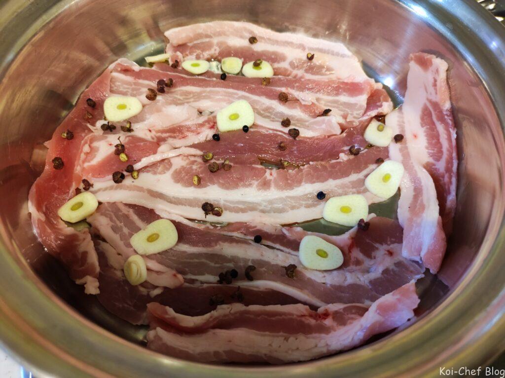 - 鍋にごま油を入れ、にんにくスライスを入れその上に豚肉、春雨、花椒、ネギの青い部分、かきを入れる