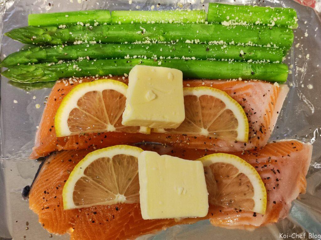 - 2のホイルにオリーブ油大さじ1を入れて広げる。その上にサーモン、アスパラガスを並べ、塩コショウを振りかけ、アスパラの上にはお好みでパルメザンチーズ適量を振り、サーモンにはレモンスライス、バターをのせて、アルミホイルで蓋をする