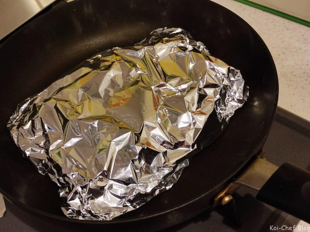 - フライパンの上で中火で約5分、アルミホイルの蓋をあけて魚に火が通ってなかったらもう1分して魚の中まで火が通ったら完成。