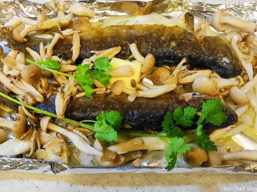 - 魚が入る大きさにプラス左右5センチ程度に切ったアルミホイル1枚をまな板に置き、端を1センチ程度折り曲げる(2回折曲げる)。玉ねぎ、しめじ適量を入れ軽く塩コショウをふり、その上に1の魚2尾をのせたら、オリーブ油大さじ1、白ワイン大さじ1をふりかけ、バター大さじ1、パクチーをのせたらもう1枚のホイルでふたをする。※隙間ができないように端を折りこむ。