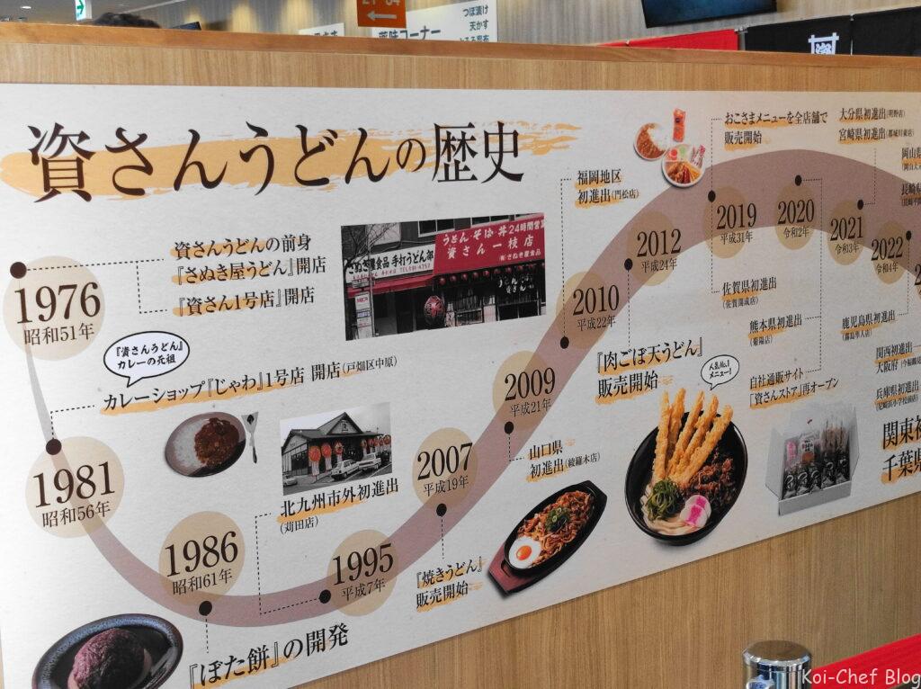 店内に入るとそこには資さんうどんの歴史パネルがお出迎え 1976年 現在の北九州市戸畑区で創業