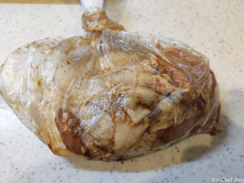 - ボウルに鶏肉用漬けタレを入れて混ぜビニール袋鶏肉と共に入れて揉み込み冷蔵庫で20分置く