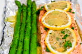 - 2のホイルにオリーブ油大さじ1を入れて広げる。その上にサーモン、アスパラガスを並べ、塩コショウを振りかけ、アスパラの上にはお好みでパルメザンチーズ適量を振り、サーモンにはレモンスライス、バターをのせて、アルミホイルで蓋をする